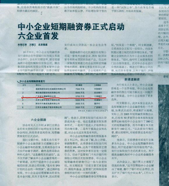 10月9日,中国银行间市场生意商协会正式启动了中小企业刊行短期融资券试点,我司成为首批刊行短期融资券的6家中小企业之一,公司从准备申报质料,到获得注册通知,仅用了22天时间,预计约莫两周之后,公司就可以拿到刊行短期融资券召募的3700万元资金,约占公司净资产的40%。 首批中小企业短期融资券的乐成刊行具有主要意义。一是在一定水平上缓解了中小企业的资金压力。与其他...